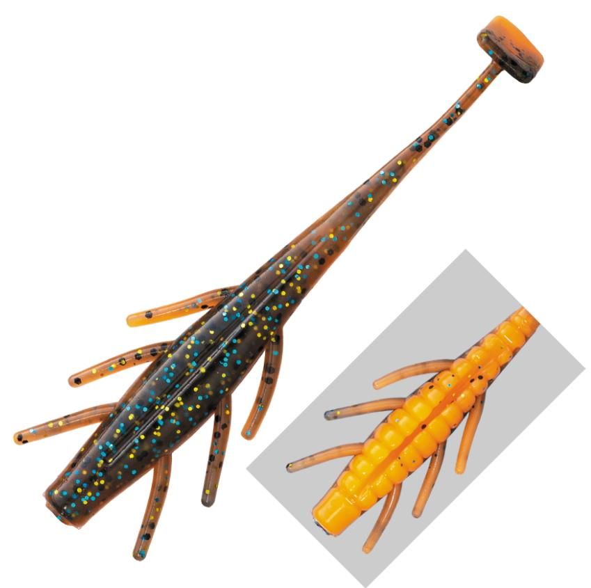 甲殻類の足と小魚の尻尾を合わせ持った独特の形状はワーム自身に大きな動きを狙うのではなく、「細かく」「優しく」そして「反応良く」をテーマに開発。独特な形状を採用したテールは、ノーシンカーのフォール時でさえもブルブルと弱く震え、一方で強い動きに反応する状況にも対応できるように、付け根にカットポイントを装備。この部分をカットするとテールが一転して暴れやすくなり、ハイアピールが可能に。そして、もう1つの大きな特徴である3本の手(足?)は強く動かし震えさせることで、まるで逃げる甲殻類を演出。なおヘビキャロを主軸に開発したもののスプリットショットはもちろんライトテキサスやジグヘッド、ダウンショットなど様々なリグに対応可能。陸っぱりアングラーに新しいワームを提案します。