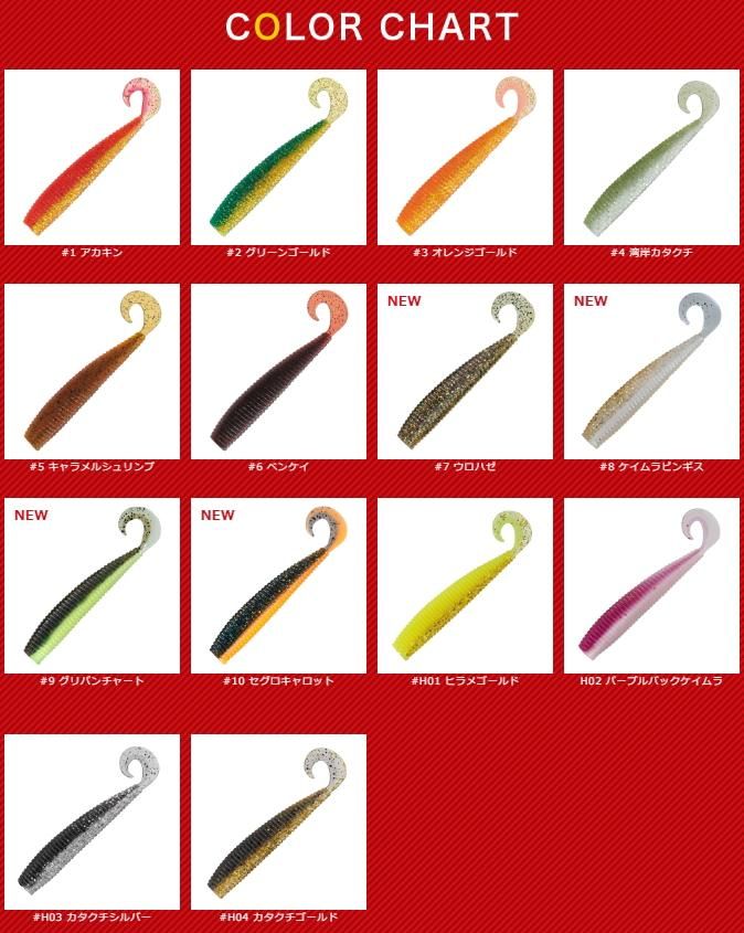 ワインドワームに今まで無かったカーリーテールを搭載したモデル。もちろん左右へのダートも問題無くこなし、カーブフォール時にはカーリーテール独特の後方水流にて魚を刺激しバイトに持ち込みます。波動は控えめですが視覚効果でも魚にアピールし、もちろん通常のスイミングアクションにも対応します。