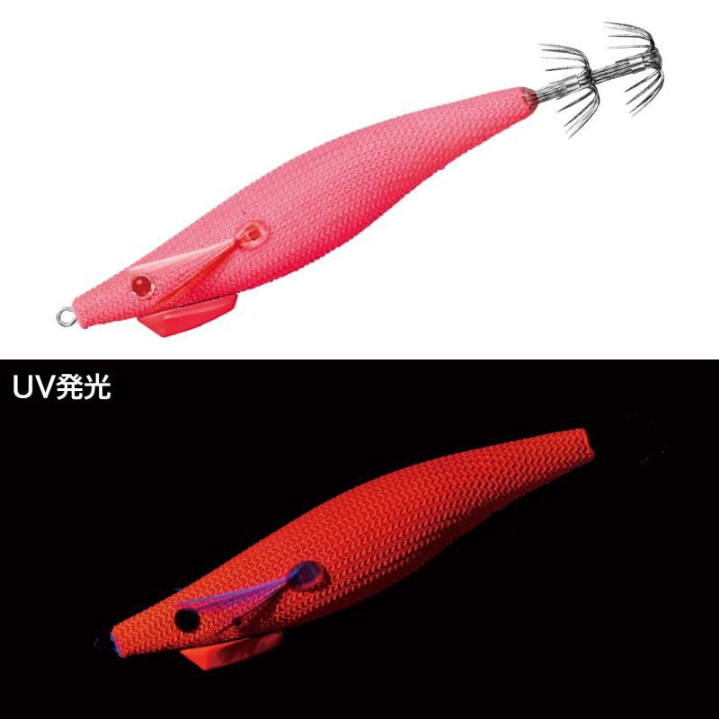 95mmにサイズアップした新エギ型ボディを採用したFタイプエギドロッパーは、エギ型形状ならではの潮受けのよい形状で安定した水中姿勢をキープしつつ、「シルエットによるアピール力」をアップさせています。サイズに対してスリムな形状を採用することで、イカが捕食時に違和感を感じにくく、喰わせとアピールという相反する要素を高次元で両立。さらに、シルエットによるアピール度が高いため、優先的にイカのサイズを上げたい状況にも最適です。