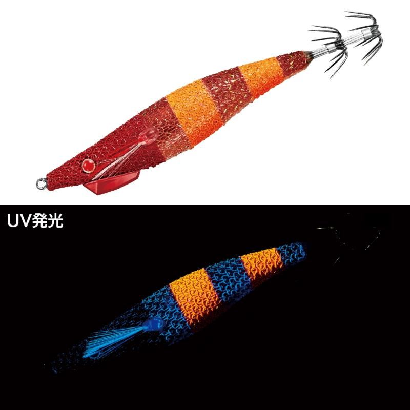 95mmにサイズアップした新エギ型ボディを採用したFタイプエギドロッパーは、エギ型形状ならではの潮受けのよい形状で安定した水中姿勢をキープしつつ、「シルエットによるアピール力」をアップさせています。サイズに対してスリムな形状を採用することで、イカが捕食時に違和感を感じにくく、喰わせとアピールという相反する要素を高次元で両立。さらに、シルエットによるアピール度が高いため、優先的にイカのサイズを上げたい状況にも最適です。