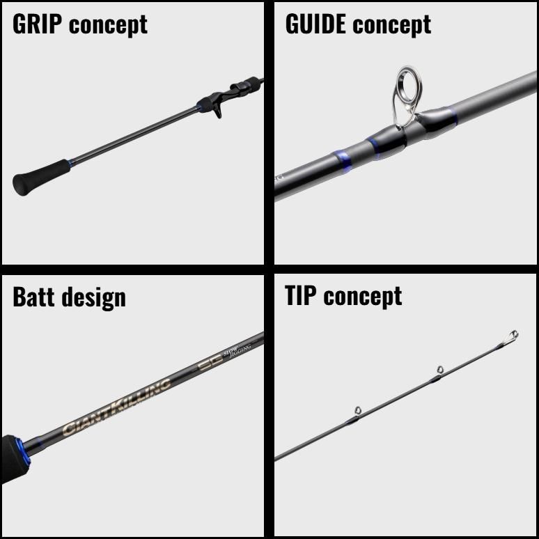 キャスティング専用船やジギングゲームの合間のキャスティングで回遊魚や青物を狙うために開発した新ジャイアントキリングは、ダイビングペンシルの使用にこだわった柔軟なティップが特徴です。もちろんキャスティング用メタルジグの操作性もバッチリ。バット部には4軸カーボンとクロスフォース製法を採用しているのでシャープなキャスティングが可能。強烈なファイトをする大型魚にも主導権を与えません。