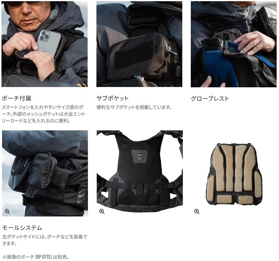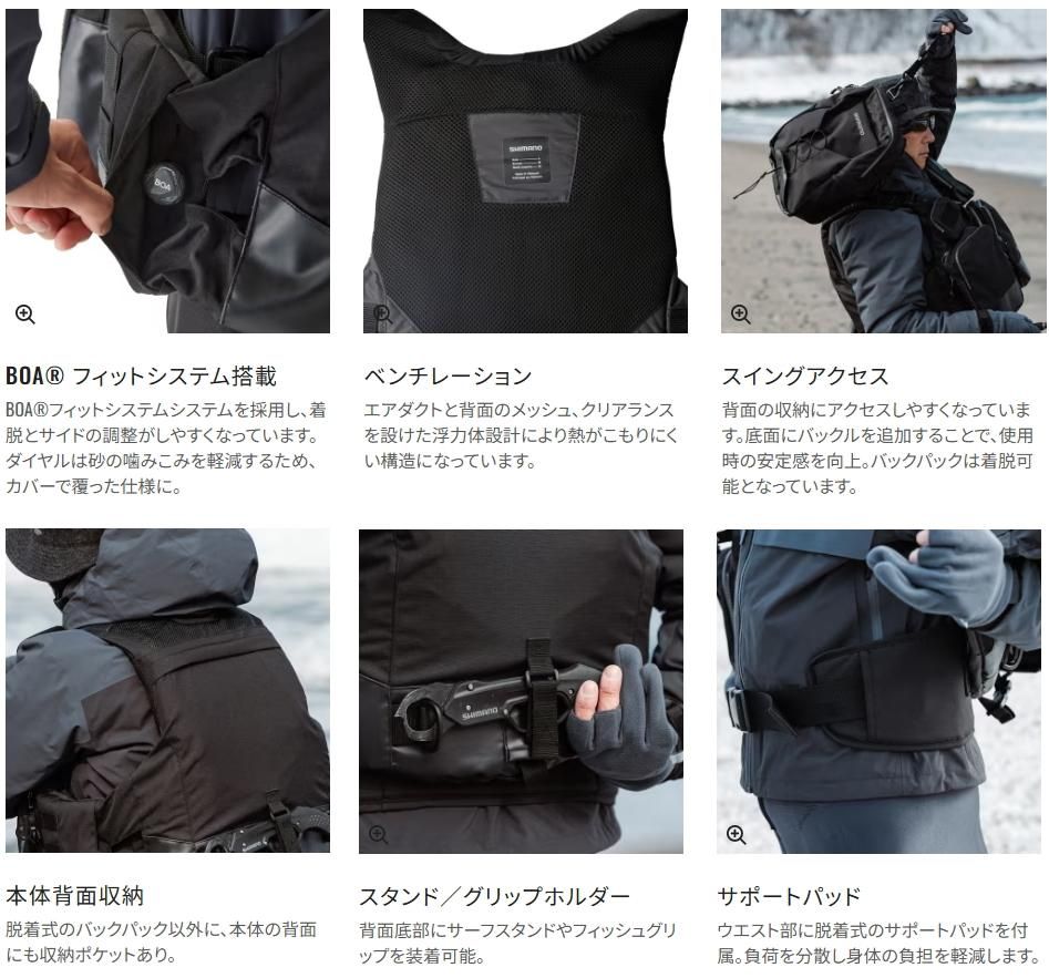 BOA(R)フィットシステムでサイズ調整がしやすいフラッグシップベスト。タックルの荷重を分散するウエストパッドや、バックパックへのスイングアクセスを採用しています。また、通気性を向上したベンチレーションにより熱がこもりにくい構造になっています。
