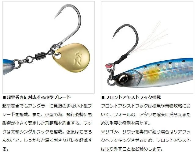 人気のサワラブレードジギングに対応するコンパクトジグ。安定感抜群の低重心ボディと小型ブレードで超早巻きに対応。ブレードのキラメキと波動がサゴシ、サワラに効果を発揮。また、フロントアシストを搭載しているため、根魚や青物などをターゲットとしたショアスロージギングにも対応。早巻きだけではなく、スローな誘いもできる多目的ジグ。フックは、フロントにティンセル仕様のサクサスアシストフック、リアには大物の強い引きにも耐える太軸シングルフックを搭載。しっかりと深く刺さりバレを軽減する。