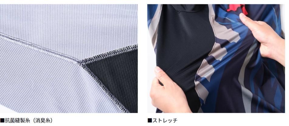 脇下部分は、通気性に優れたストレッチのメッシュ素材に切り替えることで動きやすさと快適性を両立。