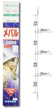 船釣り用のメバル胴突仕掛で3本針2組入です。ロングハリス30cmで幹糸との結節部はカラミ止めのピーズ仕掛になっています。C-100のメバル専用針を使用していますので、メバル以外の大物にも強さを発揮します。枝針の取替えも簡単に出来ます。