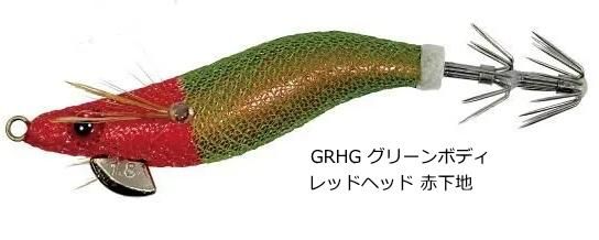 グリーンの胴体に赤ヘッドが際立つ定番カラー。イカの捕食本能を刺激する王道配色。