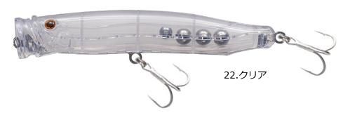 軽いジャークでもポップサウンドを奏でるマウスカップは音質重視。水面ぎりぎり、ほぼ直立の浮き姿勢は吸い込みやすく、ピンスポットの集中ポッピングも可能に。コンパクトボディ、高比重で飛距離も抜群。シイラ、カツオ、マグロ、青物、ヒラスズキとターゲットは幅広く、ショアでも、オフショアでも使う場所も選びません。