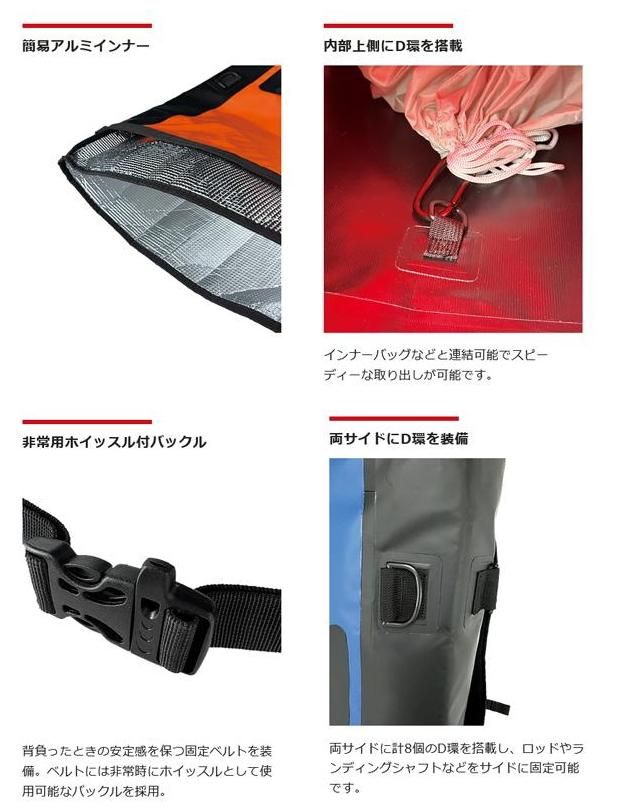 クーラーボックスの持参が困難な地磯釣行に必須のアイテム。かさばる荷物の持ち運びや、釣った魚の持ち帰りもOKです。防水リュックをベースに、両サイドにロッドなどを装着できる多目的D環を計8個装備。フロントにはバンジーコードを装備し、アウターなどを一時的に収納できます。内側にも多目的D環を装備し、インナーバッグを取付可能。簡易のアルミインナー付きです。