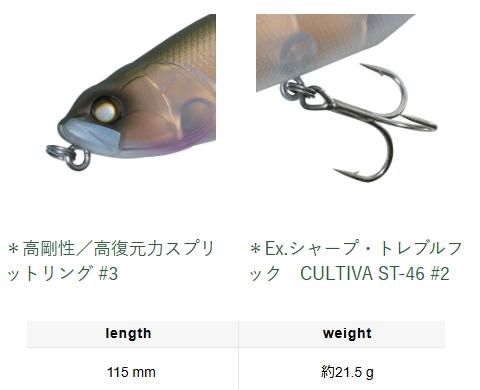 空気抵抗軽減のためボディは大きすぎないこと。アクションのキレを優先するためウェイトは重すぎないことを旨に、LIVE WIREのすべてをスケールアップ。ひとつひとつの動きにドライヴ感をもたせるべく開発。原型製作も放電加工型の最終彫刻もプロトモデルの内部構造試作も、開発者新家氏自身の手作業。強力なドライヴ感を伴うショートスライド、すべてのアクションに伴うヒラ打ち。水に絡みつつも切り裂く動きが、フィッシュイーター達の捕食衝動を喚起。ダイブや水面直下のダートも織り込むことができるので、レギュラーからイレギュラーまで様々なアクションが可能。反射板内蔵により表面にホログラムを配したものとは異質の「底光り」的な反射光が特徴。ラインアイ、フックアイともに1.3mm径の高強度タイプを採用。ボディ肉厚は1.5mm。耐衝撃性向上と海や外国の強い歯や顎を持つ魚たちも想定内です。「肉厚ボディは動きが鈍いのでは?」なんて心配も無用。日本国内ではバスのみならず、スズキやシイラ、青物にも高実績。クリア系カラーはシルエットが明確になりすぎないため、攻略が困難なシラスナブラ発生時にも好適と言われています。