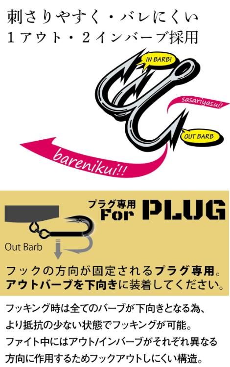 Gamakatsu×Ja-doコラボトレブルフック!「刺さりやすくバレにくい!」をコンセプトに開発されたのが『邪道エクレールフック』。トレブルS P-MHをベースに3本のうち1本をアウトバーブ化。アウトバーブを下向きに装着することで、「アウトバーブとインバーブが同時に掛かっている場合」にバーブ同士が引き合ってバレにくい構造になっています。特にミノーにおすすめで、サポートフックとしても優秀なフックです