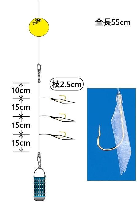 魚はバレにくく、服に掛かったら外しやすいスレ鈎「極(キワメ)金袖」を採用。使って楽しい・快適・簡単の三拍子が揃ったお手軽パーフェクト仕掛です。