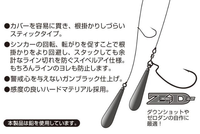 よりウィードレス性を重視したスティック型シンカーです。ダウンショットはもちろん、フリー系リグにも対応し、ストッパーで固定することも可能な絶妙サイズのスイベルアイを採用。また「ゼロダン ワーム217」にも採用しており、「オープンスイベル」との組み合わせでオリジナルのZDシステムも作成可能。