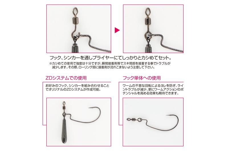 「オープンスイベル」は「ゼロダン ワーム217」等に採用しているスイベルパーツです。タックル、フィールド、スタイル等に合わせてお好みのフック、シンカーを組合わせる事でオリジナルZD(ゼロリーダーダウンショット)システムが作成可能。ZDシステムでの使用のみならず、フック単体セットではノット接続部のクリアランスを高め、ライントラブルを最少に抑える為ノーシンカーリグ、キャロライナリグ等への使用でそのメリットが光ります。