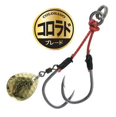 フックは従来のドラッグメタル純正フックを使用。最大の特徴であるブレード付きフックはブレードによる回転の波動とフラッシングでアピールしバイトを誘発させます。真鯛以外にもスーパーライトジギングのイサキやショアからの青物狙いにも最適なフックとなっています。