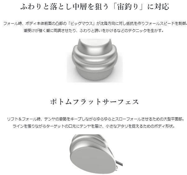 大きなの金属のヘッドを持つテンヤは構造上どうしても食い込みが浅い。活性が低い時に食い込みを待つことなく「早合わせ」できるテンヤ それが「真釣ビッグマウスSST」だ。スローテンションフォールでラインを張り、テンヤの重さをティップで感じながら誘うとその様子が手に取るように感じられ、容易に早がけさせることができる。つまりテンヤの重量をロッドがフォローするためターゲットに違和感を与えずおもしろいように喰わせることができるのだ。1ランク軽いテンヤを使えばさらに効果は倍増する。