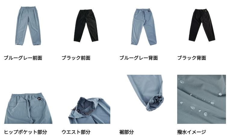 ウエスト部分はゴム&スピンドル入りで、腰回りにゆとりを持たせつつ裾を若干細くして足さばきがしやすいテーパードシルエットの撥水イージーパンツ