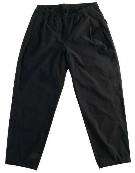 ウエスト部分はゴム&スピンドル入りで、腰回りにゆとりを持たせつつ裾を若干細くして足さばきがしやすいテーパードシルエットの撥水イージーパンツ