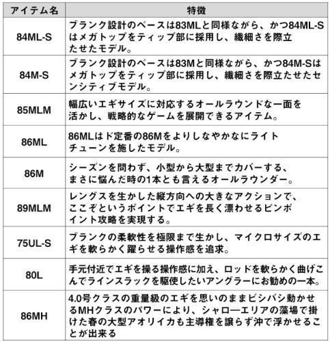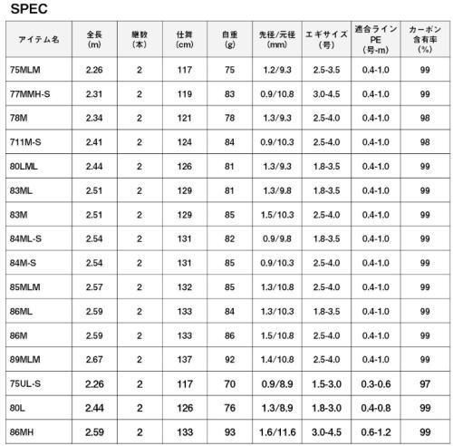軽量AIRシリーズを更に軽量化し、86Mで驚愕のアンダー90gの「86g」を達成。岡隆之、木森直樹、福島芳宏が各フィールドテスターが監修したシグネイチャーモデル。ガイドには『AGS』搭載し、バット部はCリングにてチューンナップ。ブランクには軽さだけでなく、強度も向上したSVFナノプラスを採用また、ネジレ防止の最適構造X45により更に操作性向上。