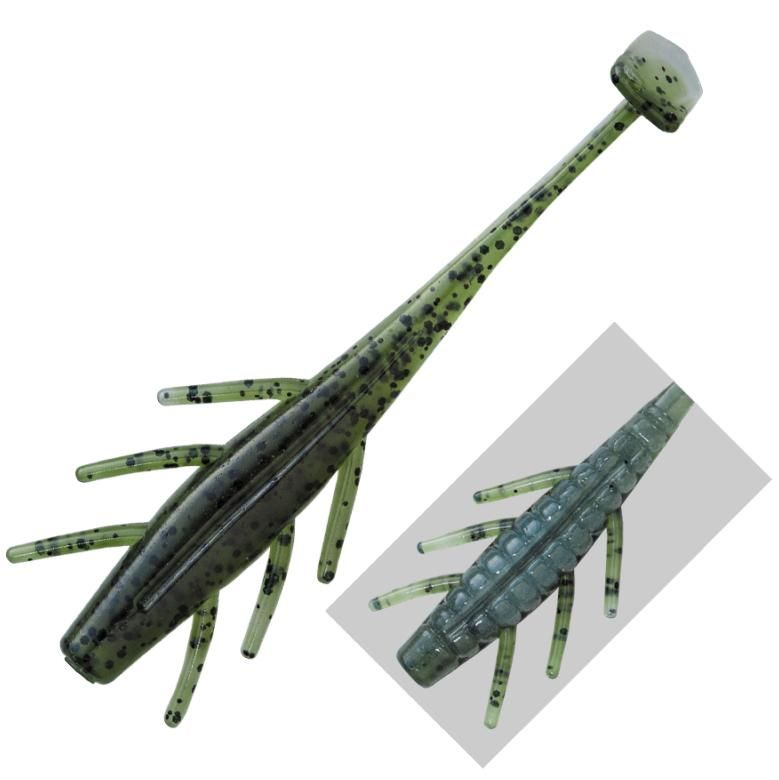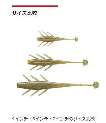 甲殻類の足と小魚の尻尾を合わせ持った独特の形状はワーム自身に大きな動きを狙うのではなく、「細かく」「優しく」そして「反応良く」をテーマに開発。独特な形状を採用したテールは、ノーシンカーのフォール時でさえもブルブルと弱く震え、一方で強い動きに反応する状況にも対応できるように、付け根にカットポイントを装備。この部分をカットするとテールが一転して暴れやすくなり、ハイアピールが可能に。そして、もう1つの大きな特徴である3本の手(足?)は強く動かし震えさせることで、まるで逃げる甲殻類を演出。なおヘビキャロを主軸に開発したもののスプリットショットはもちろんライトテキサスやジグヘッド、ダウンショットなど様々なリグに対応可能。陸っぱりアングラーに新しいワームを提案します。