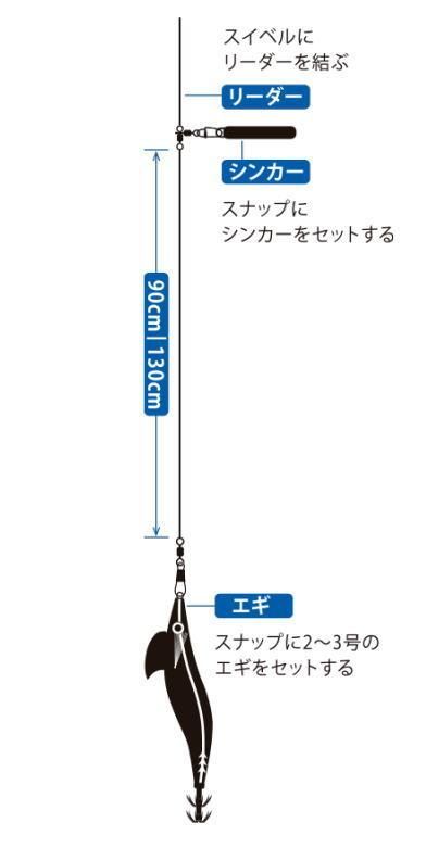 ハリスを長めに取る事で荒れた日でも船の上下動にエギが影響を受けにくく、ナチュラルにフォール、ステイするので、中〜大型ケンサキイカが興味を示すメソッドとして認知度もUPしてきています。