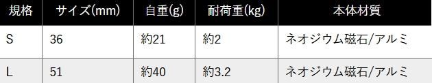 強力なネオジウム磁石でパワフル。Sで約2kg、Lで約3.2kgの耐荷重。