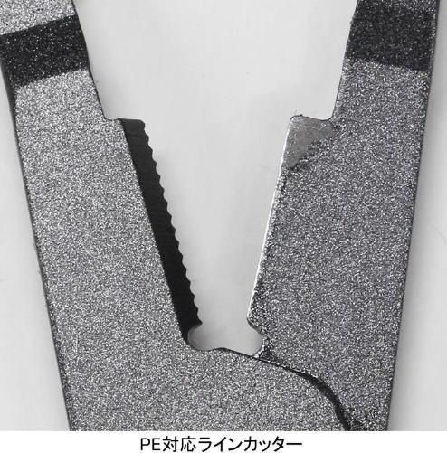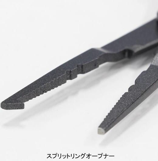 錆に強いフッ素コートステンレスプライヤー。フッ素コート加工を施したステンレスプライヤーが新登場。錆に強く汚れが落としやすいフッ素コート加工を施したプライヤー。先端はスプリットリングが簡単に外せるスプリットリングオープナー。PEラインにも対応するラインカッター。ストレート形状でフックリリーサーとしても使えるフック外し。未使用時にはロックしておくだけで安全なロック機構。カラビナなどに取り付けて脱落防止に役立つリングホールと基本性能も充実。タックルボックスなどに忍ばせるだけで多役にこなすフィッシングプライヤーです。