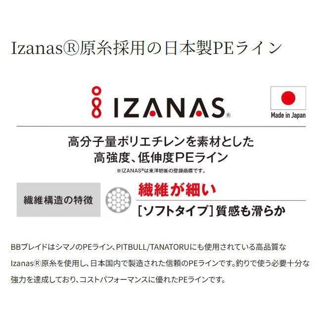 BBブレイドはシマノのPEライン、PITBULL/TANATORUにも使用されている高品質なIzanas原糸を使用し、日本国内で製造された信頼のPEラインです。釣りで使う必要十分な強力を達成しており、コストパフォーマンスに優れたPEラインです。