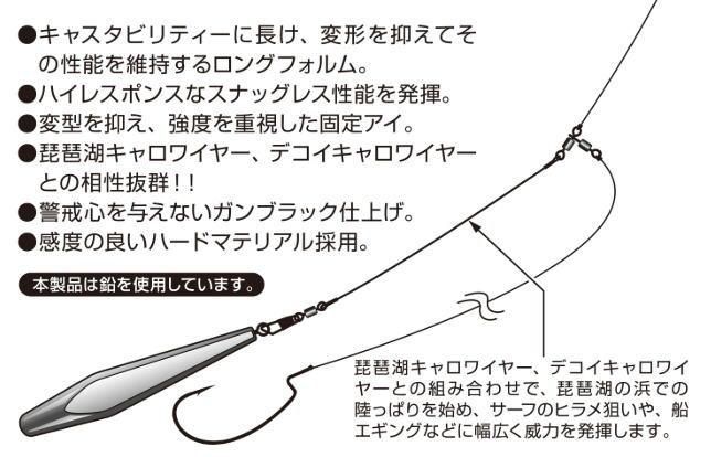 三点式ヘビーキャロライナリグにてブレないロングキャストを実現させるロングフォルムシンカーです。 ハードマテリアルを採用し、キャスタビリティーを損う「変型」を極力抑えるフォルムを追求しました。琵琶湖キャロワイヤー等とのセッティングで琵琶湖の浜の釣りやサーフでのヒラメゲーム等にも明らかなアドバンテージとなります。