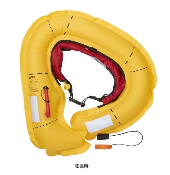 ライフジャケットの梱包パッケージを見直し、保管や移動時の持ち運びに便利な収納袋として再利用可能なものに変更。小型船舶用救命胴衣TYPE-Aを取得し、腰回りにしっかりフィットするオリジナル立体裁断設計を採用。両サイドにDリングを装備し、多彩なアクセサリーパーツの取り付けが可能。膨張時にはO字型の気室が飛び出し、安定した浮遊姿勢が取れる。装着時の厚みは約5cmで、船縁をスムーズに歩行可能。