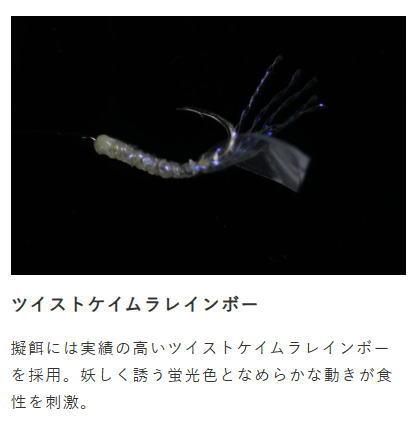 擬餌には実績の高いツイストケイムラレインボーを採用。妖しく誘う蛍光色となめらかな動きが食性を刺激。