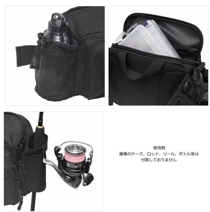 ペットボトルホルダー、ロッドホルダー、ペンチホルダーが標準装備されたウェストバッグ。
