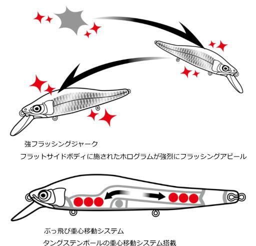 タングステンウエイトボールを搭載し、低重心バランスに仕上げることでタダ巻きでもジャーキングでも安定したアクション姿勢を保持。こだわったSF(スローフローティング)設計は、ビタッとブレーキが効いた静止状態になるため、ジャーキング時の動と静のメリハリを抜群に発揮。フックは#6サイズの太軸を採用しており、シーバスやサワラ、青物など幅広い釣りに対応します。