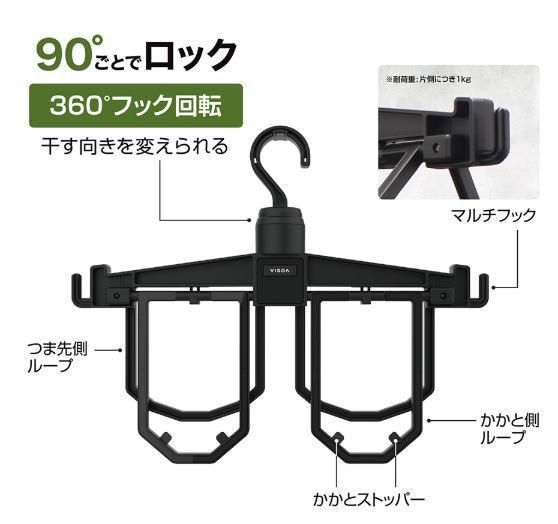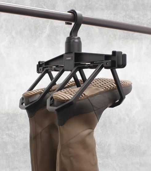 ●洗ったウェーダーや磯靴、長靴等のサイズの靴等を逆さまに干すことができる高剛性のハンガーです。