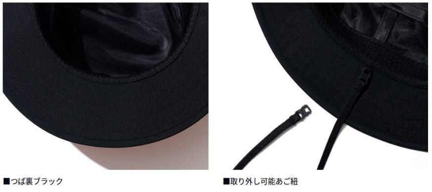 防水透湿性に優れるGORE-TEX素材を採用したハット。額が濡れないようつばと本体の接合部までシームを施し、防水性を保つ仕様。風で飛ばされにくいよう、取り外し可能な顎ひも付き。