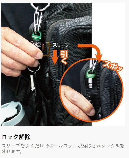 タックルの脱落を防ぐ強力ボールロック機構を採用したマグネットジョイント。装着時はボールロックピンで固定されており、飛んだり跳ねたりした衝撃でも脱落を防止。タックルを外すときはスリーブを引くだけ。装着はマグネットの磁力でオートロック。玉の柄やギャフなどの重量物でもしっかりロック。ネットが岩や枝などに引っかかっても不意の脱落を解消。精密マシンカットに表面硬度を高めるアルマイト処理をした軽量アルミボディ。外観をスリム化して従来品比較約30%軽量。