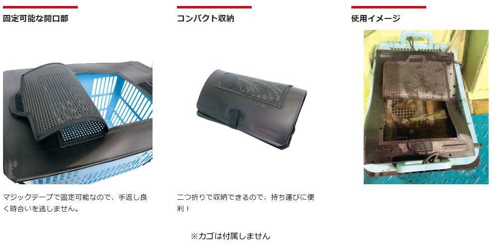 遊漁船の備え付けカゴに対応するイケスカバー。イカの噴射による飛沫や、生け簀からの脱走を防止します。時合中は開口部を開いたまま固定できるので、手返しよく時合いを逃しません!さらに収納時は二つ折りでコンパクトに収まるので持ち運びに便利です。