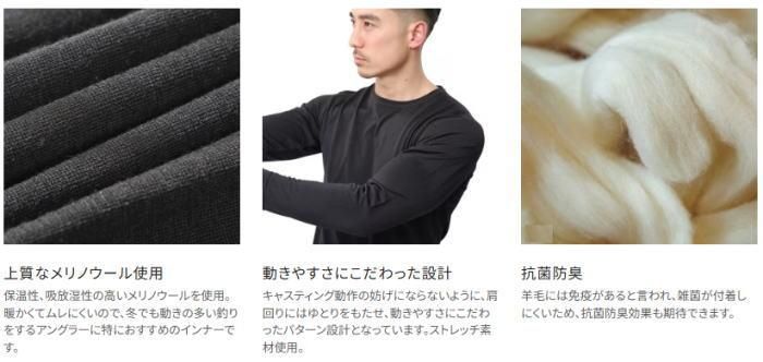 上質なメリノウールを使用したインナー。保温性と吸放湿性の高いウールを使用することで、寒暖差のある釣りの環境でも快適に過ごせます。ポリエステルとの混紡にすることで速乾性、耐久性も両立。ストレッチ素材で動きやすい設計で冬のアングラーを快適にサポートします。