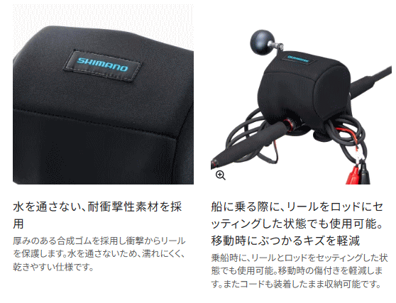 シマノ電動リール専用リールガード。本体部には、耐衝撃性のある素材、カウンター部分にはハードボードを内蔵することで、リールへのキズや衝撃を軽減。リールにロッドをセットし、コードをつけたままでも装着可能です。