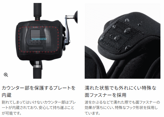 シマノ電動リール専用リールガード。本体部には、耐衝撃性のある素材、カウンター部分にはハードボードを内蔵することで、リールへのキズや衝撃を軽減。リールにロッドをセットし、コードをつけたままでも装着可能です。