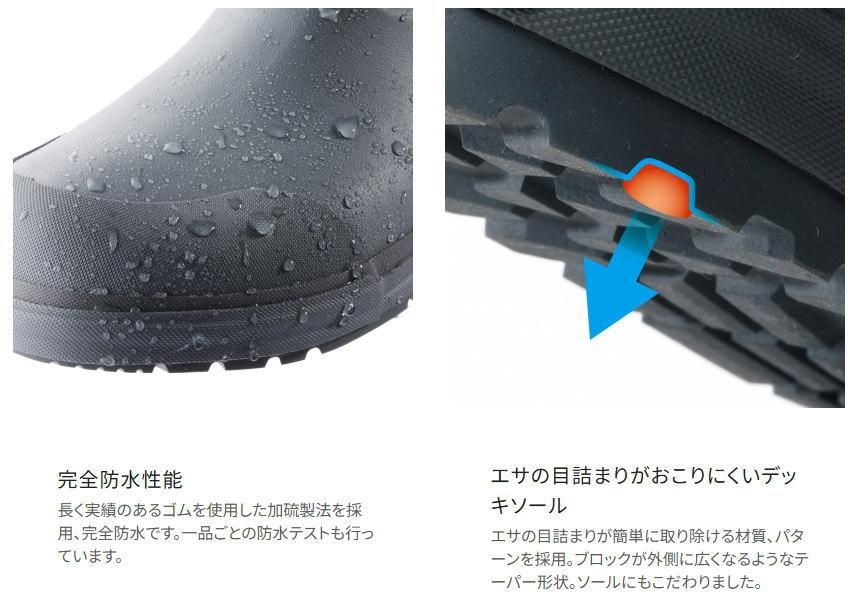 防寒船ブーツがさらに暖かくなりました。新しい防寒船ブーツには、フェルト材にアルミシートを挟み込んだソックスが内蔵されています。そのソックスと同じ材料のインソールも付属しており、ブーティーとブーツの間に入れることで足裏部分が二重構造になり、より暖かさをキープします。二重構造によりフィット感も向上します。ブーツ本体にはヒールキッカーが付いており、脱ぐ際も楽々です。また、シマノオリジナルアウトソールはエサを使うことを考慮した設計で、ブロックが大きくエサの目詰まりを起こしにくい構造になっています。ソールの材料は非常にソフトで、優れたグリップ力を発揮します。アッパーはラバー製で、汚れてもメンテナンスが簡単です。まさに餌師の冬の定番となる防寒ブーツです。