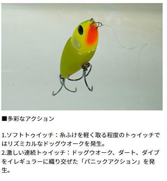強烈な「水面を叩きつける音」に「重低音ラトルサウンド」をプラス!集魚性能UP+シーバスの捕食スイッチを入れる。(ボーン素材ボディ+大径ラトルウエイト+カップマウス)×立ち姿勢により、激しいサウンドとスプラッシュを発生。マウスカップが生む泡の軌跡が魚を寄せる!!連続トゥイッチでイレギュラー&ダイブ、トリッキーアクションが混ざったドッグウオーク=パニックアクションが簡単に発生する。移動幅が大きすぎないドッグウォークアクションを設定。リア重心で安定した飛行距離。65Fはチニングにもオススメ。130Fは立ち姿勢を水平気味にし、ドッグウォークアクションのしやすさを追求した。