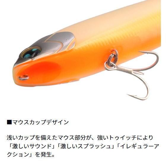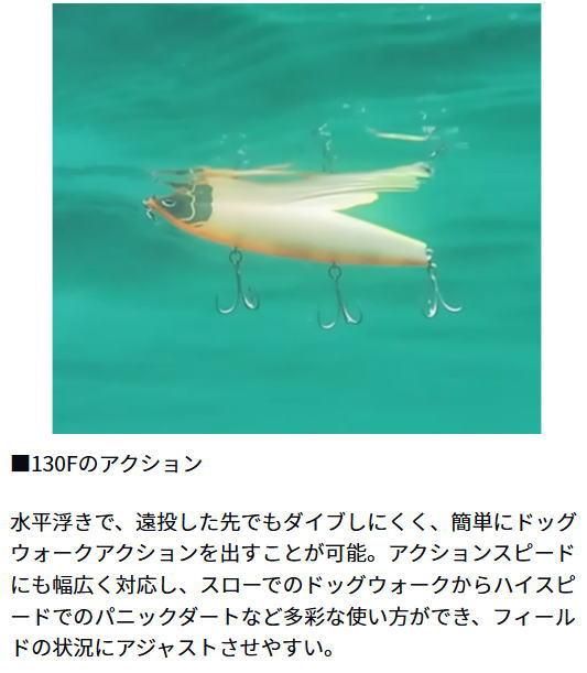 強烈な「水面を叩きつける音」に「重低音ラトルサウンド」をプラス!集魚性能UP+シーバスの捕食スイッチを入れる。(ボーン素材ボディ+大径ラトルウエイト+カップマウス)×立ち姿勢により、激しいサウンドとスプラッシュを発生。マウスカップが生む泡の軌跡が魚を寄せる!!連続トゥイッチでイレギュラー&ダイブ、トリッキーアクションが混ざったドッグウオーク=パニックアクションが簡単に発生する。移動幅が大きすぎないドッグウォークアクションを設定。リア重心で安定した飛行距離。65Fはチニングにもオススメ。130Fは立ち姿勢を水平気味にし、ドッグウォークアクションのしやすさを追求した。