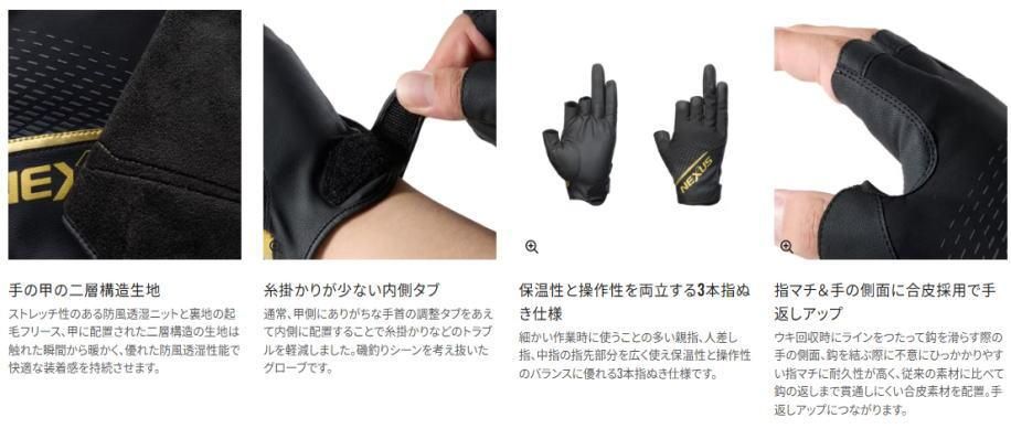 ストレッチ性のある防風透湿ニットと起毛フリースの二層生地を手の甲に配置し触れた瞬間から温かさを感じる快適な装着感を実現しています。通常、甲側にありがちな手首の調整タブを内側に配置することで糸掛かりなどのトラブルを軽減しています。鈎が引っかかりやすい手の側面や指マチには貫通しにくい合皮素材を配置し、トラブルを軽減し手返しのスピードアップにつながります。保温性と操作性のバランスに優れる3本指ぬき仕様、磯を楽しむための基本性能をしっかりと備えたグローブです。