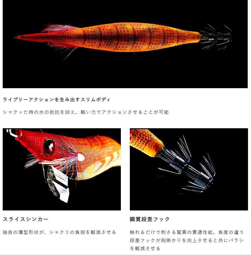 シャクリの負担を軽減させる独自の薄型形状の「スライスシンカー」や、フッ素コーティングを施した貫通性能と、鈎掛かりを向上させるとともにバラシを軽減させる性能を持つ「瞬貫段差フック」など、随所に釣れる工夫を施しました。