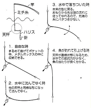 形状記憶合金でゴムのように柔らかく曲がり、しかも直接記憶させて、強く曲げても元の直線形状に戻るようにさせた超弾性力合金で、種々形の天秤にも対応できる万能型ハイテクL型天秤です。他の天秤に比較して天秤の線径が抜群に細い。船べりなどに天秤が当たっても追従性が高い。しなやかで張りがある。クルクル巻いてコンパクトに収納可能(軽量であり持ち運びが楽である)。沈みが良く速い。水キレ抵抗が少なく、2枚潮、3枚潮時にもイトフケが出にくい。アマダイ、カサゴ、ヒラメ、クロダイ、ヒラマサ、ワラサ、ブリなど天秤使用の全ての釣りに適している。水キレ抵抗が少ない為、掛けた魚がバレにくい。耐久性はステンレス鋼に比べ、錆に対して数倍の寿命を持ちます。水中の抵抗が少なく軽い為、魚の当たりが一層敏感に分かる。