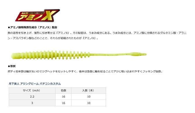 一般的に使用される素材「塩ビ」を採用することで揺れる船上でもジグヘッドにセットしやすい。さらにサイズは、現行のアジングビーム2インチと3.5インチの中間的なサイズである3インチ。アジのサイズの大きい南紀エリアだけでなく全国的に使える「丁度良いサイズ感」に仕上げた。