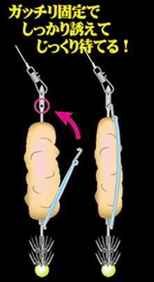 お好みのエサを通し刺しにして、ストッパーバンドでアイに固定するだけ!エサズレ、エサ落ちを防ぎ、しっかり誘えてじっくり待てる!カンナにエサが被らず確実フッキング!
