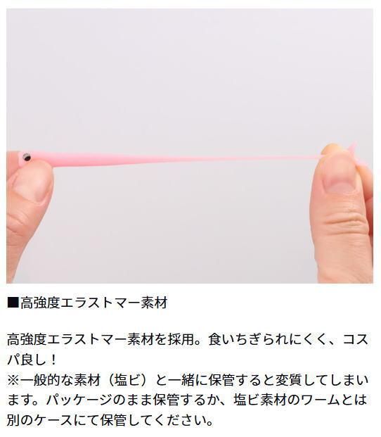 リアルな尾びれを搭載した小魚シェイプのワーム。ボディをロールさせながら広範囲のメバルにアピールすることができるミドストアクション対応。低活性時にはただ巻きでもピリピリとアクションするテールで魅了する。エビオイルを配合。味とニオイでヒットチャンスを更に広げる。