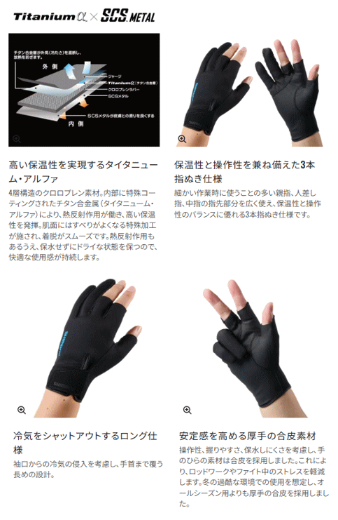 保温性のあるタイタニューム・アルファに加え、過酷な環境での使用を想定し手のひらの合皮素材を厚くすることで耐久性を向上させました。手首まで覆うロング仕様で防寒性にも優れています。保温性と操作性のバランスに優れるオーソドックスな親指、人差し指、中指の指ぬき仕様となっています。冬の釣りを楽しむための保温性と操作性をしっかりと備えた汎用グローブです。今季から縫製糸を変更してほつれにも強くなりました。