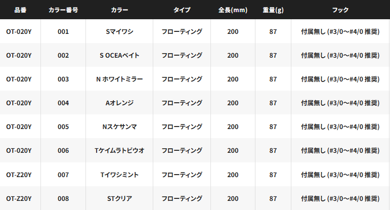 ターゲットが水面に出きらない状況においてより真価を発揮するダイビングペンシル・ダイブフラットのダウンサイズモデル。全長200mm・本体重量87gのフォルムはベイトサイズも使い手も選ばない王道の“ど真ん中”サイズ。その日のファーストキャストを託すパイロットルアーとして、あるいはスモールベイト&タフコンディション対策の切り札として、国内外を問わず絶対に外せない1本に仕上がっている。もちろん、キレ味鋭いローリングと強烈なフラッシング、ラトルサウンドのアピール力は先行モデル240Fをそのまま踏襲。高速リトリーブにも破綻することなく泳ぎ切るアクションは注目のノンストップジャークにも高度に対応。新たに採用した高強度貫通プレートの内部構造も相まって、ヒラマサ、GTといった大型魚との出会いをいっそうエキサイティングに演出する。